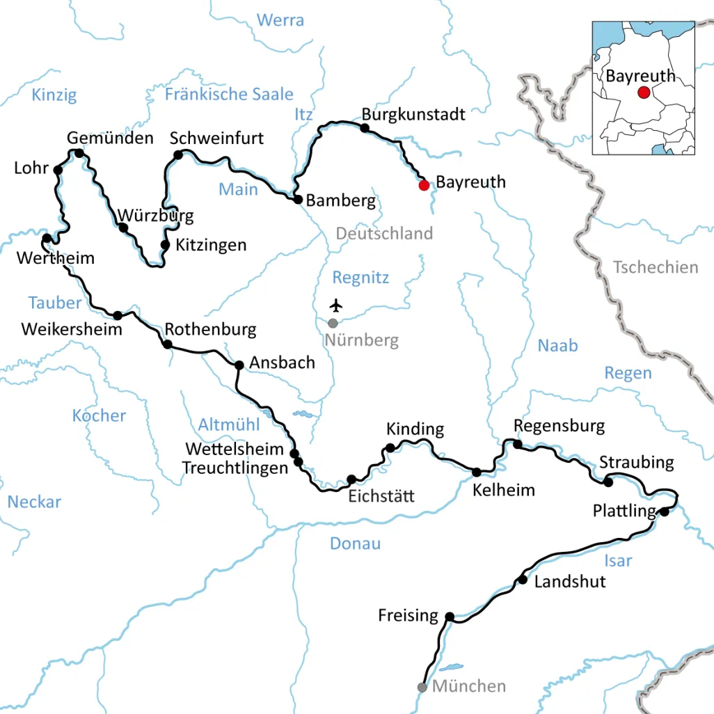Our cycling vacation takes you through Germany's largest federal state in three weeks - bavaria. It starts in the festival city Bayreuth. You soon follow the course of the River Main. After a detour to the Regnitz in Bamberg, you cycle relaxed to Schweinfurt, along the Volkacher Mainschleife, into the old episcopal city of Würzburg and past Wertheim Castle. It won't be hard to say goodbye to the Main, as the next stages of the Bavaria cycle tour take you into the equally beautiful Tauber valley, which is famous for its wine-growing, the Renaissance castle in Weikersheim and the medieval town of Rothenburg. A few kilometers away, you cycle along the Franconian Rezat and get to know the baroque town of Ansbach. You cycle imperceptibly through the Franconian Lake District, including the Altmühlsee and the Altmühl, which you follow leisurely past Pappenheim Castle, the Twelve Apostles and the baroque town of Eichstätt to Kelheim. The Bavarian cycle tour continues along the Danube, which you accompany on three stages. One of the destinations is Regensburg, whose old town ensemble is a UNESCO World Heritage Site. From Deggendorf, the journey takes you to the Isar. Stage by stage, you cycle through the foothills of the Alps, including the well-known towns of Landshut and Freising. A trip to Munich is of course a must on the Bavaria cycle tour. However, the Bavaria cycle tour is not only full of exciting places that you will get to know, the abundance of landscapes, nature parks, castles, palaces and of course the varied Bavarian cuisine also offer the perfect conditions for a successful vacation.