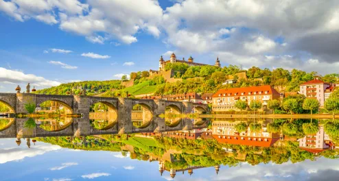 Continuing along the Main, you cycle via Ochsenfurt to the old episcopal city of Würzburg. It is known for its impressive baroque architecture, including the Residenz, which is a UNESCO World Heritage Site. It is considered one of the most beautiful baroque palaces in Europe and impresses with its magnificent rooms and beautifully landscaped courtyard garden. The Marienberg Fortress on a promontory above the River Main is also well worth a visit. Numerous traditional wine taverns invite you to enjoy Franconian wines and local specialties after an exploratory walk.