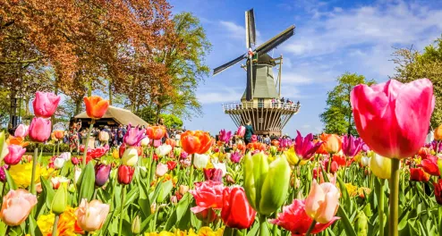 Discover highlights such as the Zaanse Schans near Zaandam, the impressive Grote Kerk in Haarlem, and of course the famous Keukenhof – a breathtaking sea of millions of tulips. Early birds can witness a truly special event: the world’s largest flower auction in Aalsmeer.