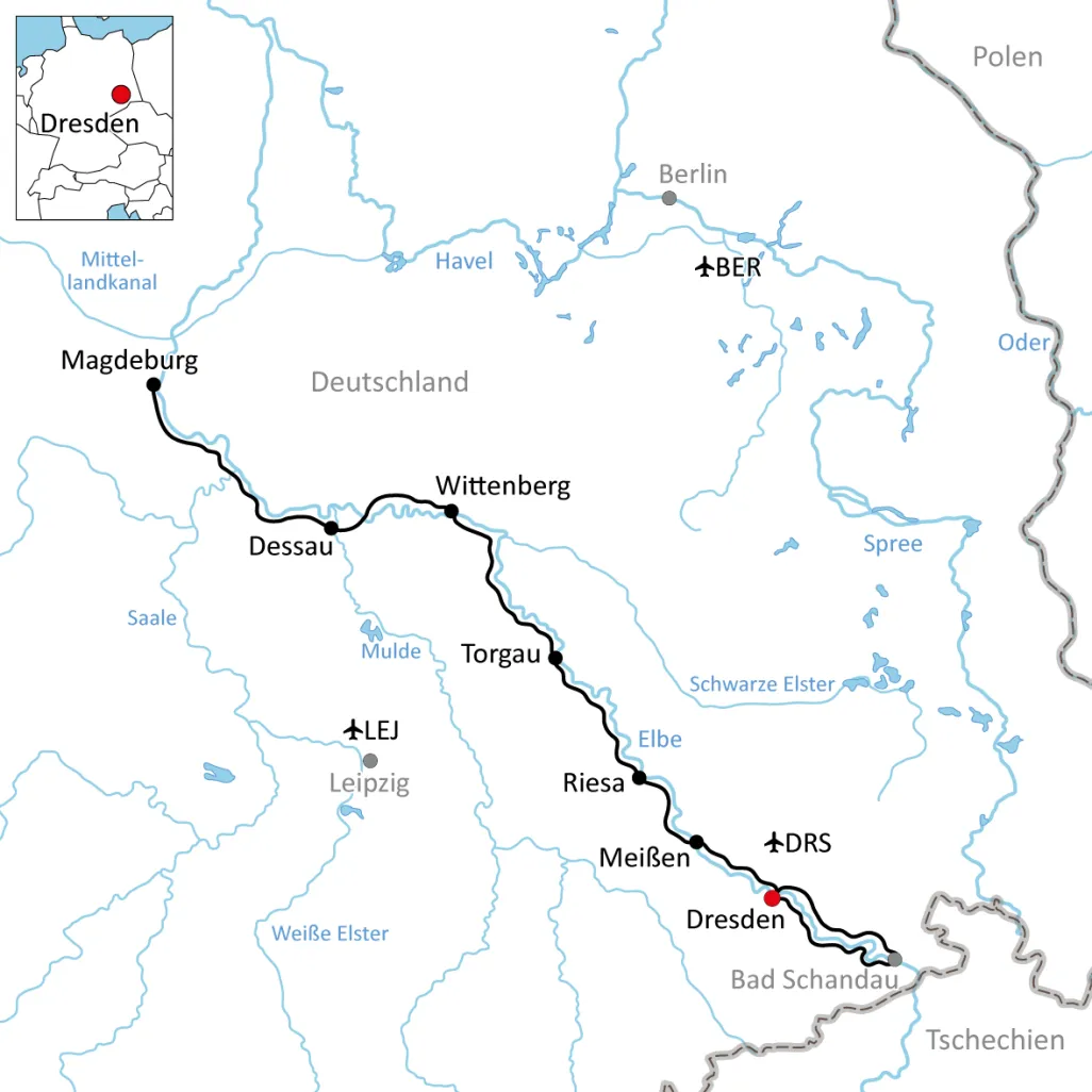 across famous names such as Martin Luther, Karl May or Walter Gropius. The daily legs of our our bike tour along the Elbe through Saxony are easy to handle, and in many cases you can even take a short cut.