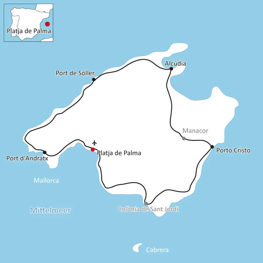 The last stage takes you along the mountain road to Es Capdellà with magnificent views of the Tramuntana mountains. The route continues through Esplores, a small, charming village, before you finally reach the island's capital, Palma. There you can visit the impressive Arab Baths, a relic from the Moorish past, and the magnificent Almudaina Palace. Stroll through the lively market halls of Mercat de l'Olivar and enjoy the unique atmosphere of the city. On your return to Playa de Palma, you will have time to reflect on the experiences of the past few days and enjoy the beach.