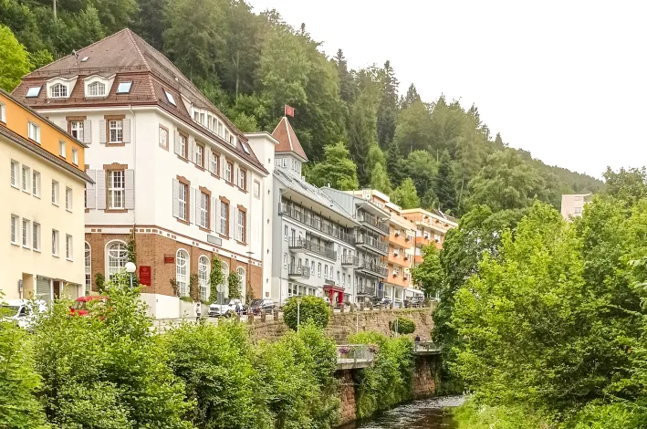 This stage of your cycle tour on the nature park cycle path in the northern Black Forest takes you from Ettlingen back into the Black Forest. In Neuenbürg you meet the River Enz, which you follow upstream. Through tranquil forests and accompanied by the gentle sound of the water, you cycle in the footsteps of the Enz valley raftsmen. At the Calmbach Rafting Museum, you will gain fascinating insights into the region's traditional forestry and timber industry. Your destination for the day is Bad Wildbad, known for its relaxing thermal baths. Whether in the historic Palais Thermal or the modern Vital Therme - it's a wonderful place to recharge your batteries.