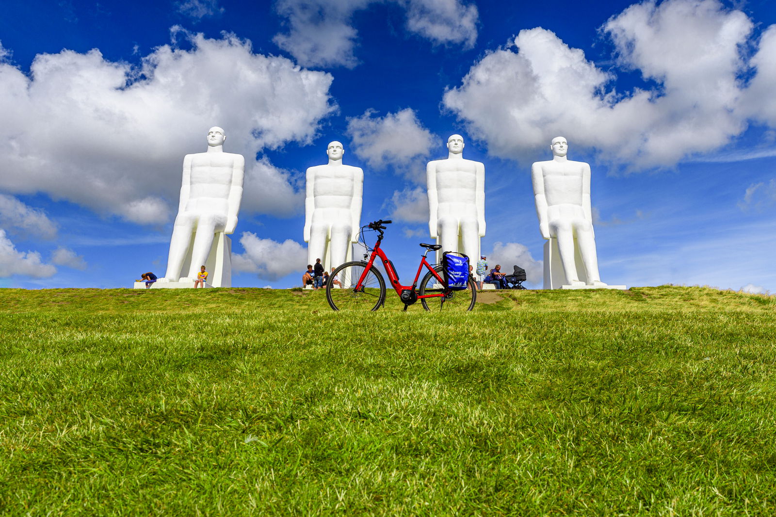 Today you cycle from Kolding Fjord to the North Sea! You leave Kolding in a western direction crossing southern Jutland. Follow the even path until you reach Esbjerg. Founded just over 150 years ago, Esbjerg developed into the most important port city on the Danish North Sea coast. One of the town's landmarks is the Vandtårnet right by its harbor. From the top of the 33-metre-high water tower, you have a view over the town, the harbour and the Wadden Sea all the way to the island of Fanø. Make a detour to the beach at Sædding. The striking sculpture group Man by the Sea towers over the beach.