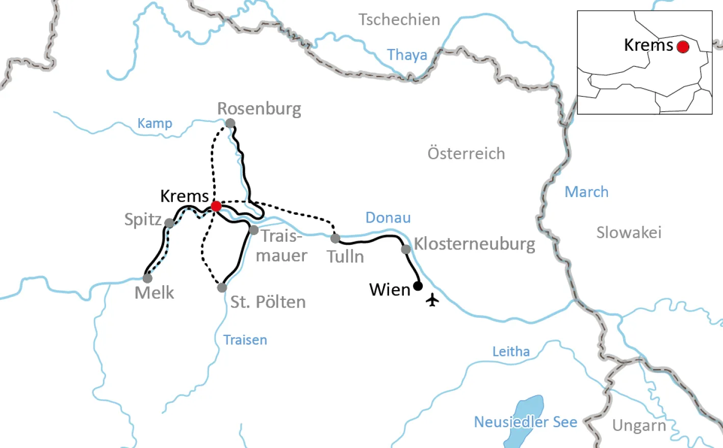 This bike tour through the Wachau has a lot to offer. Enjoy a week in one of the most beautiful regions in Austria. Spend the first few days in Krems and explore the region from there. You cycle along the three rivers Danube, Kamp and Traisen and encounter the baroque old town of St. Pölten, the magnificent Benedictine Abbey of Melk Abbey, the Renaissance Rosenburg Castle and the Roman town of Tulln. The region is also internationally renowned for its wines. After a tour through the breathtaking landscape with its numerous vineyards and orchards, you should definitely stop off at a typical Austrian Heurigen. Here, the winegrowers serve their wine directly at the winery! Spend the last two nights in Vienna and get to know the city on a discovery tour. A bike tour through the Wachau is perfect for leisure cyclists who don't like to pack their bags every day and want to explore the region without the hustle and bustle.