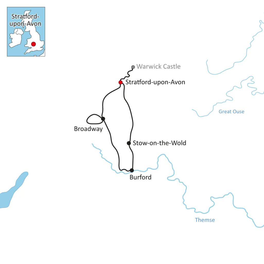 The start and end point of your journey is Stratford-upon-Avon, the birthplace of William Shakespeare. From there, your route takes you to magnificent castles, such as the imposing Warwick Castle, through gentle valleys, past quaint pubs, blooming gardens and vast sheep pastures. You will cycle on small, barely used roads and paths through typical English landscapes, discovering small towns such as Broadway, Burford and Stow-on-the-Wold – charming places full of history, culture and British lifestyle.
