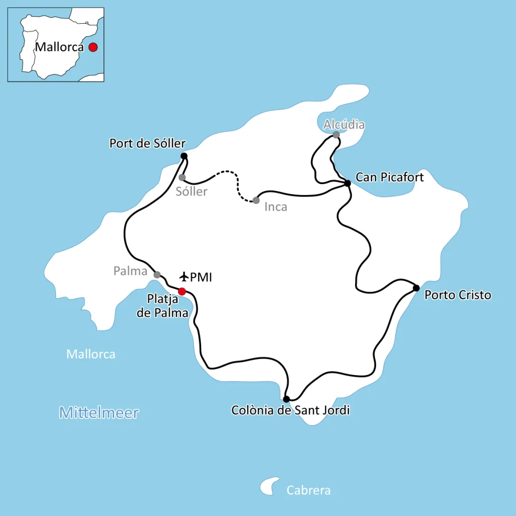 The largest of the Balearic Islands is the focus of our cycle tour in Mallorca. The island, bursting with diversity and joie de vivre, will inspire you from the first day. Get to know Mallorca far away from crowded beaches and tourist strongholds. The starting point of our bike tour in Mallorca is Playa de Palma. As a district of the island capital Palma, the beach of the same name is known beyond the Spanish borders. Along the coast you will cycle to the settlement of Capocorb Vell and the salt fields around Colònia Sant Jordi. The dragon caves of Porto Cristo and the pearl town of Manacor are also highlights of our bike tour in Mallorca, as is a detour into the Tramuntana mountains.