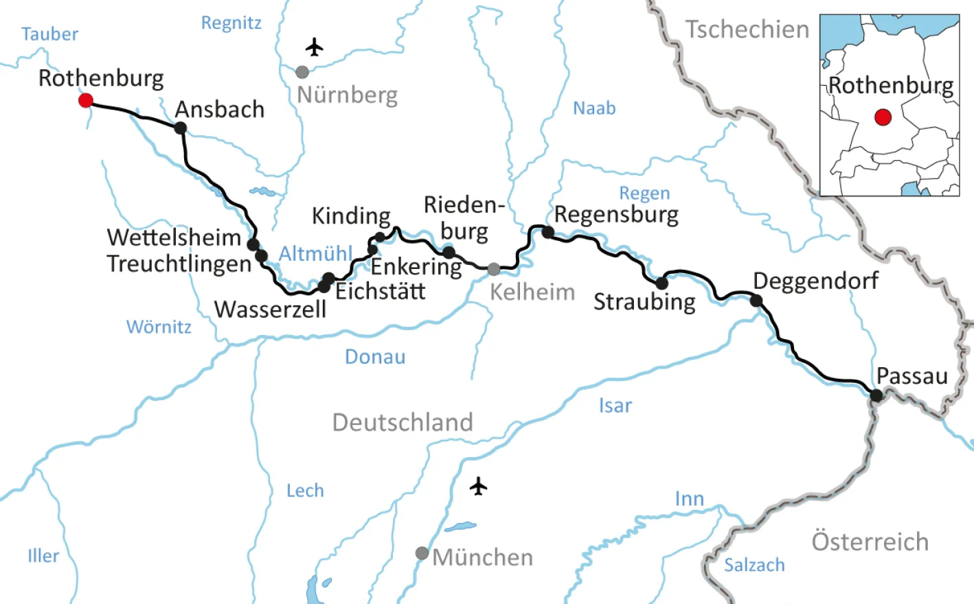 This extended cycling holiday leads you through Franconia and Lower Bavaria. You will start off cycling along the Tauber River and then along the Altmühl and Danube Rivers. Rothenburg, Eichstätt, Regensburg and Passau are well preserved historical cities along the tour, which otherwise runs through scenic countryside. The Walhalla Temple high above the Danube is worth a visit. At the end of your trip, in Passau, you can enjoy a boat trip along the three rivers Danube, Inn and Ilz. This Altmuehl and Danube cycling tour is also suitable for those who do not cycle often.