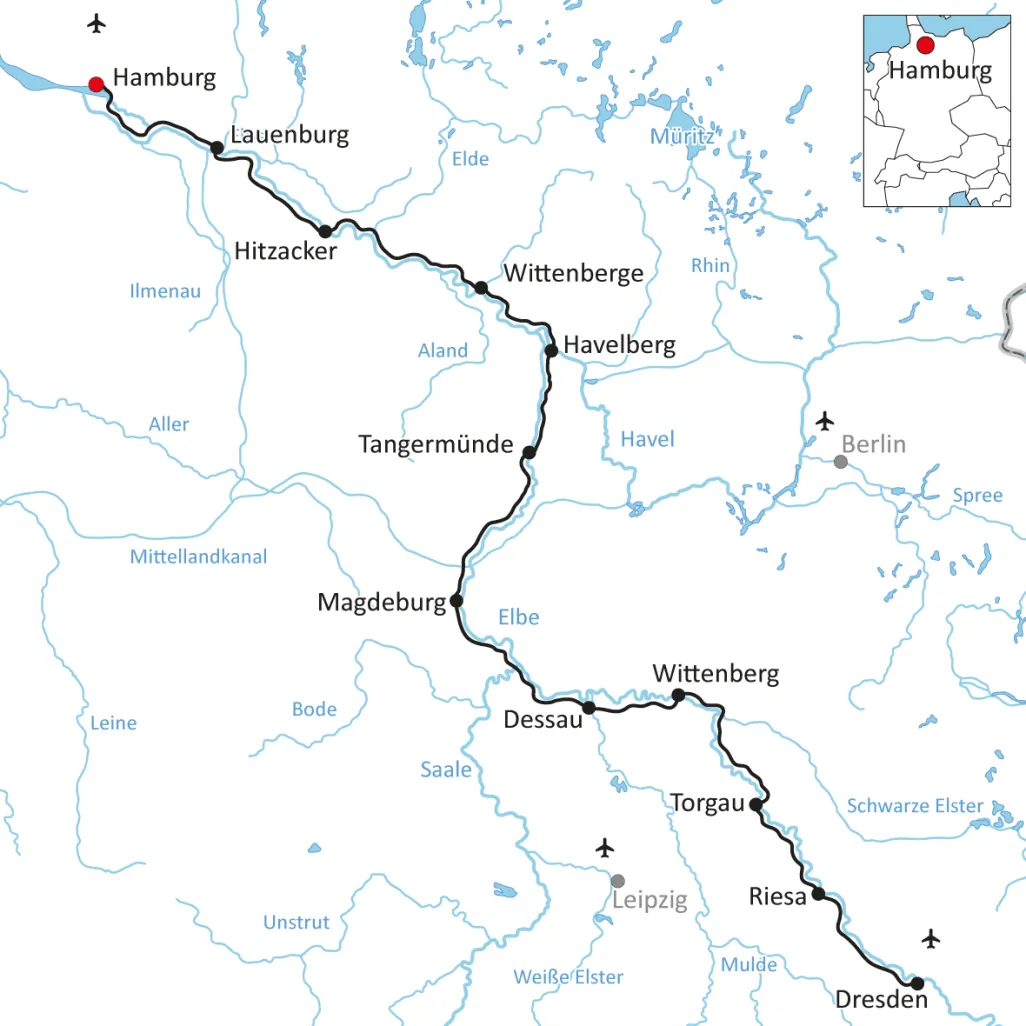On your Cycling Holiday on the Elbe, you will cycle from Hamburg to Dresden along a large part of the Elbe Cycle Path, which is one of the most beautiful cycle paths in Germany. Six federal states – each with its own history, landscape and culture. This is exactly what makes the journey so varied. You will experience the flair of the state capitals: Hamburg with its large port and lively city center. In Magdeburg, those interested in culture will find the Hundertwasser House. And last but not least, Dresden with its long history and numerous sights. Cycle along dykes, through moors, nature reserves and vineyards on well-signposted paths. Treat yourself to an extended break and watch the grazing sheep and the passing birds in the wonderfully peaceful and wide landscape. The great thing is that the Elbe Cycle Path can often be cycled on both sides. The many yaw ferries – motorless ferries that use the current of the river – make it easy to change banks.