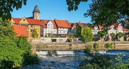 Today, you will leave the foothills of the Solling behind as you journey along the Weser Cycle Path to Fürstenberg Castle, a stunning example of Weser Renaissance architecture. Originally rebuilt around 1600 as a hunting lodge, it provides breathtaking views of the Weser Valley. Continuing your route, you will pass through the historic Hanseatic town of Höxter. It is renowned for its charming half-timbered buildings. Bodenwerder today's destination is the birthplace of the legendary Baron Münchhausen.