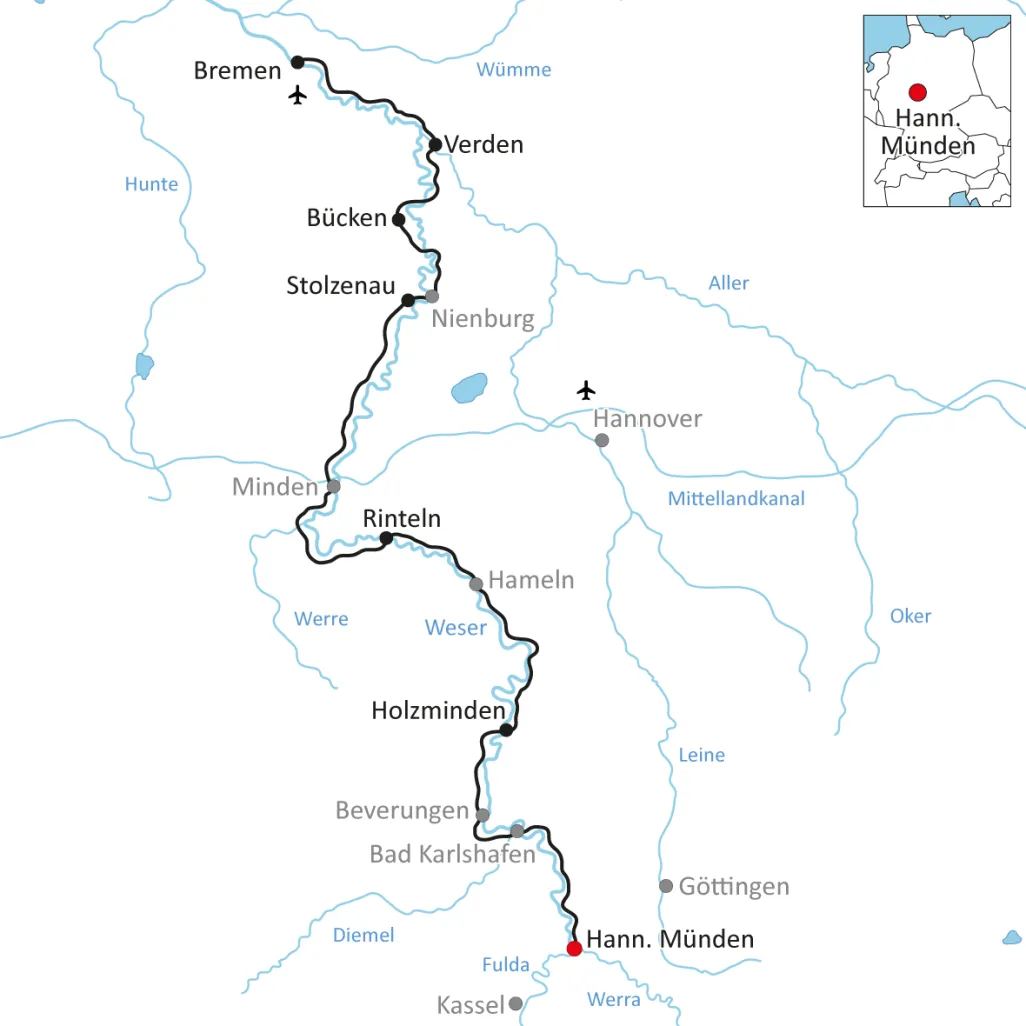 The cycling tour along the Weser is for trained cyclists who are not afraid of longer stages and still value sightseeing. You start your bike tour where the Weser has its origin. In Hann. Münden, the Werra and Fulda rivers flow into each other and merge into one of the most important rivers in Germany, the Weser. You cycle along the mountain ranges of the Weserbergland and reach the vast land of the North German Plain at Porta Westfalica. Yours is Germany‘s smallest state and the former Hanseatic city of the same name, Bremen. What makes a bike tour along the Weser so special? These are the excellently developed bike paths through idyllic and tranquil nature, sleepy villages with breathtakingly beautiful marketplaces, magnificent manor houses and castles. The architectural styles from Romanesque to Gothic to the important keyword of the so-called Weser Renaissance will accompany you during the entire cycling tour on the Weser for sporty people.