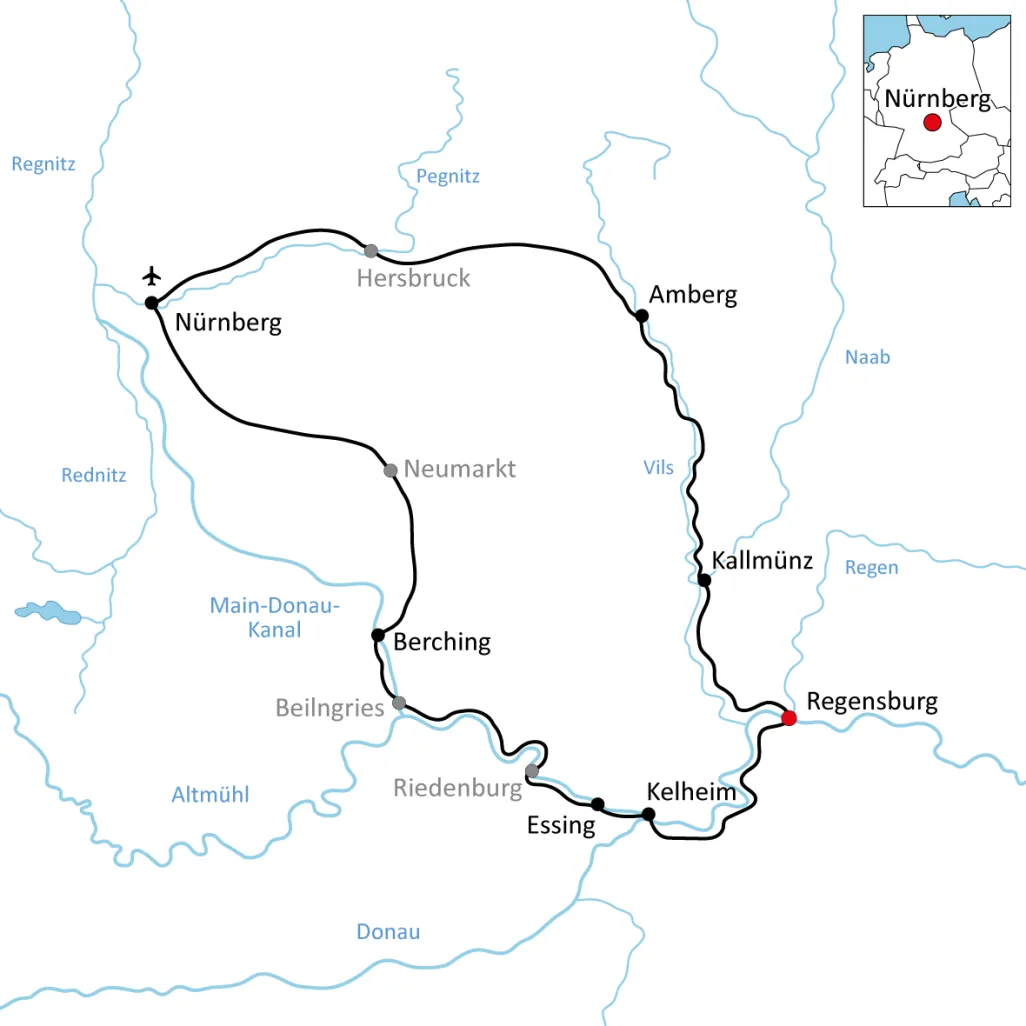 Come with us on the Five Rivers Cycle Route and experience a varied, enjoyable cycling tour. In one week you will cycle through the romantic river valleys of the Altmühl, Danube, Naab, Vils and Pegnitz. It never gets boring, as the landscape is so varied. Striking rock formations meet gentle hills, dense forests meet sparse juniper heaths. Again and again you will see imposing castles and historic palaces. Take time to explore the beautiful old towns like Nuremberg and Regensburg. Don‘t miss visiting the alleys of the dreamy little villages. Let yourself be carried away by the cosiness and hospitality of the locals. Numerous cosy beer gardens and traditional inns await you. Try Bavarian delicacies such as Obazda and sour Zipfel. The best accompaniment to these hearty meals is a freshly tapped, cool beer, for which Franconia and Bavaria are known throughout the world. As you can see, the journey on the Five Rivers Cycle Route promises enjoyment in every respect!
