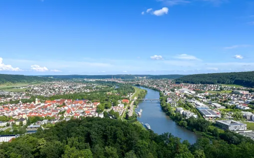 The first stage of the Five Rivers Cycle Route takes you along the Danube up to the river Naab at Mariaort. You 'll follow the river through an idyllic valley lined with limestone cliffs. Kallmünz welcomes you with its castle complex, visible from afar. The ruins date back to the 10th century. If you choose the side-quest and climb the hill, you will be rewarded with a magnificent view of the Naab Valley. Another local curiosity is the house without a roof. Located below the ruins it is a cave where the opening is enclosed by a plastered wall which includes a door and several windows.