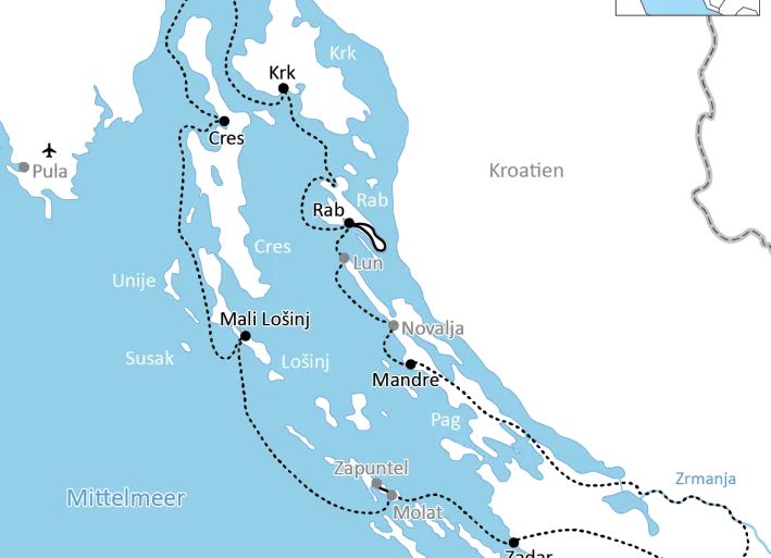 Today, you will take a closer look at the island of Pag with its partly barren, partly lush green meadows: you will sail to Lun on the north-western tip of the island. Around 80,000 olive trees grow here! And even more impressive: some of them are already around 1,200 years old! You will learn all this and more during a guided tour of the grove. After a long swim, the ship will set sail for the island of Rab. The old town of the main town stretches along a long headland and has a number of sights to offer.
