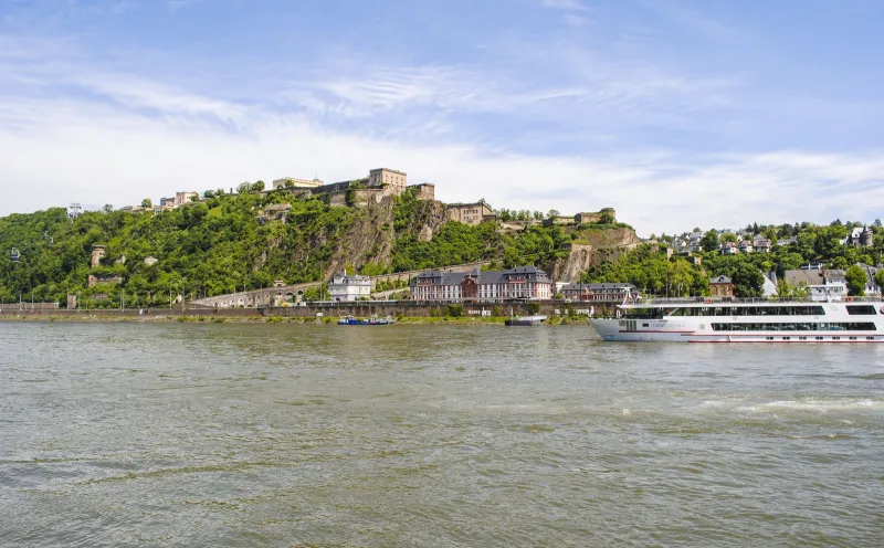 Castles line the route of today's stage. Decide for yourself which one you want to make a detour to in order to enjoy the magnificent view over the valley and take a souvenir photo. Cycle on at a leisurely pace and follow the Moselle to the Deutsches Eck, where it flows into the Rhine. If you've always wanted to get up high, we recommend taking the cable car across the Rhine up to Ehrenbreitstein Fortress. From there you can enjoy a breathtaking view over Koblenz. Afterwards, treat yourself to dinner on the riverside promenade with a view of the river.