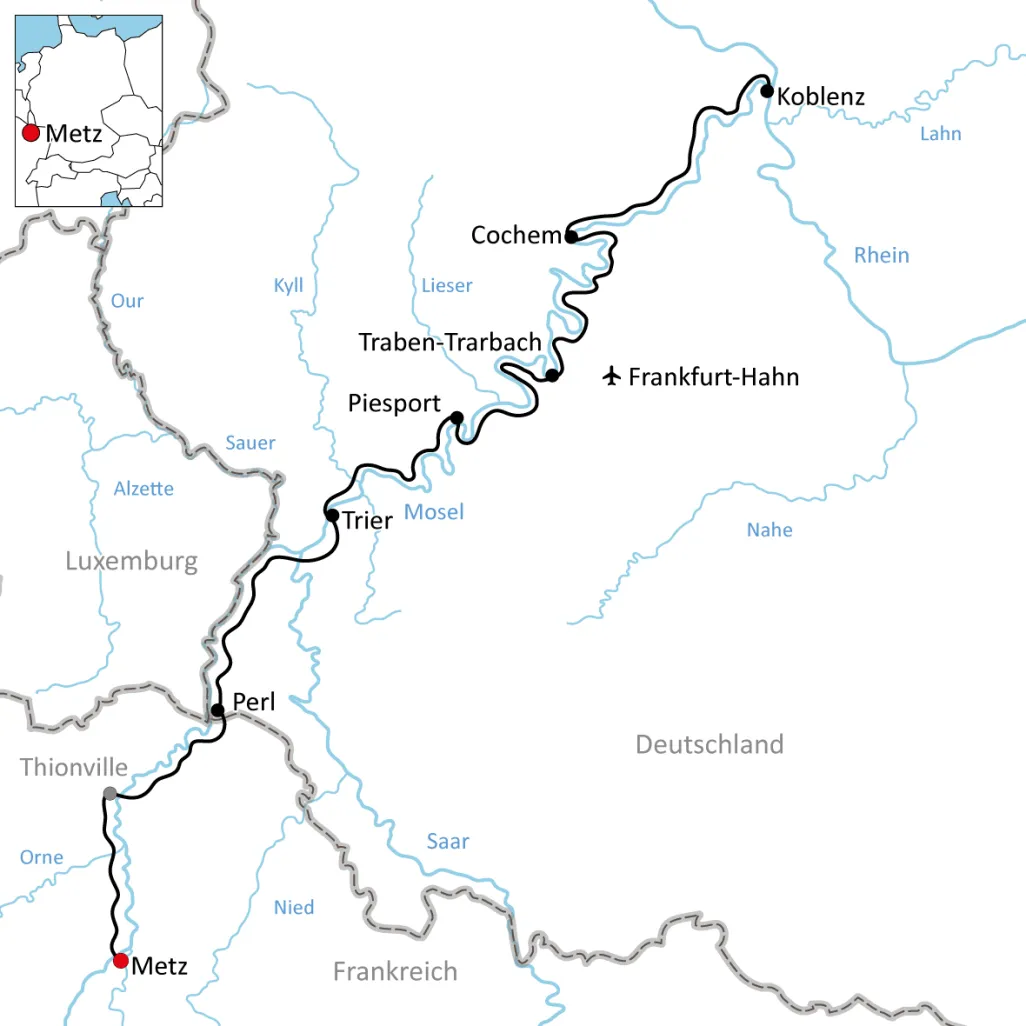 Discover the beautiful landscape of Germany‘s oldest wine-growing region on your cycle tour along the Moselle. The cycle path meanders along the banks of the river as winding as the river itself. Starting in Metz in France, you cycle relaxed into the border triangle of France, Luxembourg and Germany. You cycle leisurely past lush green vineyards and through numerous small towns with picturesque half-timbered houses. You will be delighted by the warm hospitality of the locals in the well-known wine-growing villages of Neumagen-Dhron and Piesport. Stop off at a wine tavern and sample the fine wines and culinary specialties of the region. Even the Romans appreciated the privileged location of the area and built their settlements. Explore and marvel at the numerous contemporary witnesses in Perl, Trier, Mehring and Koblenz. Look forward to an exciting cycle tour along the Moselle that won‘t leave you bored.