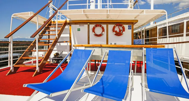 • Features: Sun deck (150 m²) with sun loungers, tables and benches on the foredeck and the covered deck, saloon with air conditioning, WLAN